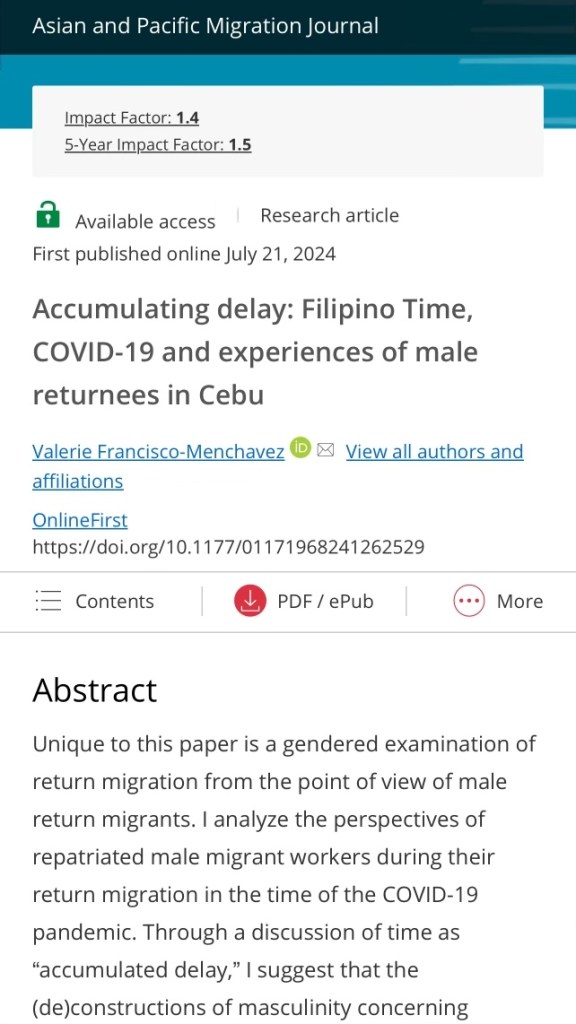 My research with serial migrants who were impacted by the COVID-19 pandemic, and subsequently, still trying to figure out their next migratory aspirations. Time and critical temporalities studies became one lens in which I made sense of the participants experiences. Informed by critical Filipinx studies, and Allan Punsalan Isaac’s most recent book, Filipino Time, and the scholarship of temporalities and migration, I aimed to write about aspirational migrants’ experiences.